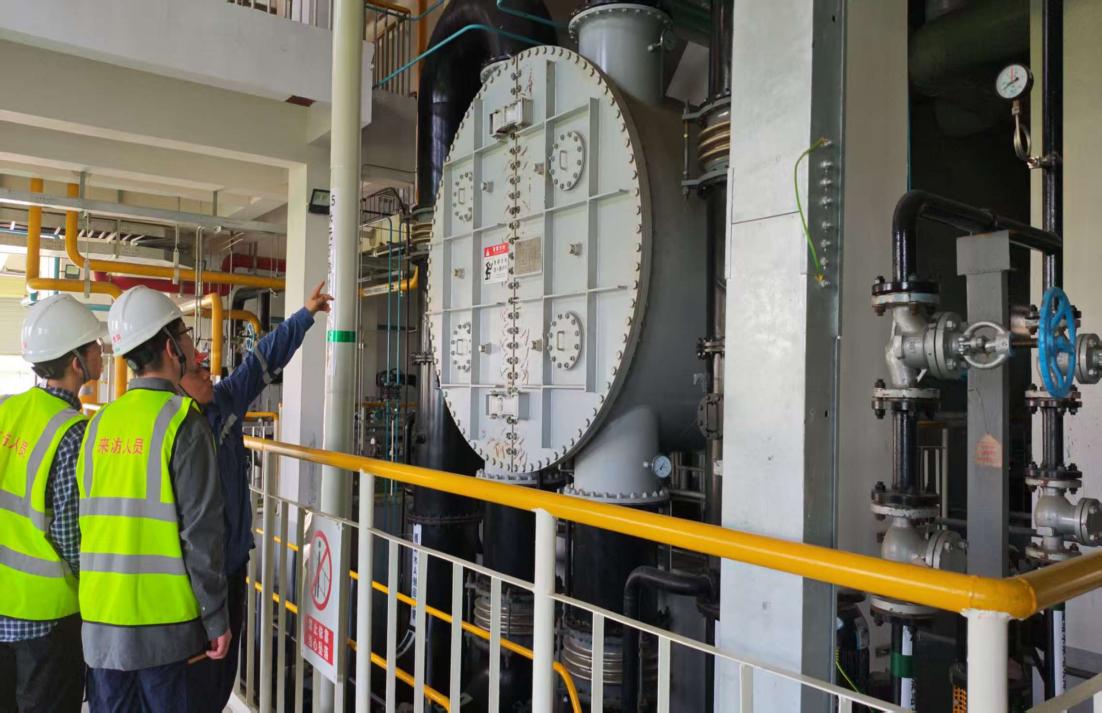 随后,团队来到循环冷却水系统,这里的冷却塔高达8米,汽轮机排出的乏汽的热量在凝汽器内传递至循环水,吸热后的循环水进入冷却塔,通过风机冷却风的对流冷却后,再送回凝汽器里循环使用。“水力循环系统是保障机组热效率的关键,冷却塔的冷却效果直接影响蒸汽参数,我们通过优化风机转速、调整喷淋角度,将循环水温度控制在合理范围,确保机组综合效率比普通发电厂更高。”林炯炯指着冷却塔的水位监测仪补充道,“项目投产后,联合循环机组年发电供热总耗气量0.948亿立方,一年可减少碳排放15.3万吨,这就是清洁能源项目的环保价值。”